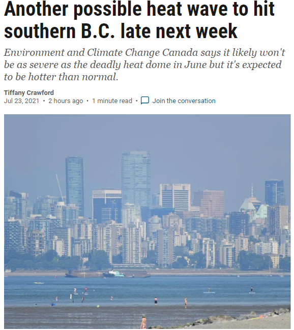 【加拿大乐活网lahoo.ca 程序综述】加拿大环境部气象学家Bobby Sekhon 7月23日警告称,包括大温在内的BC省南部海岸很可能将在7月底迎来新一波热浪。但他表示,这波热浪不会像6月底的热浪那么恐怖,但BC省南部海岸的居民还是会感觉比平时热得多。