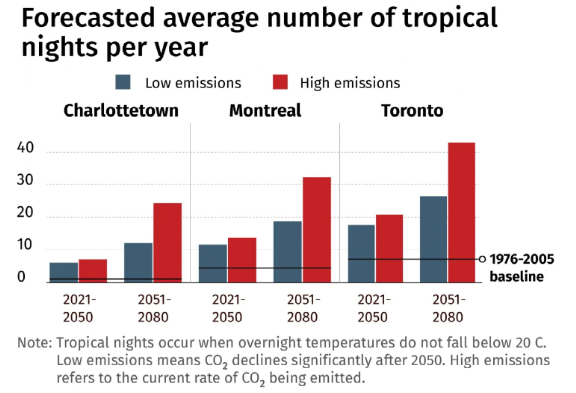 (夏洛特城、蒙特利尔和多伦多三地夜间温度突破20摄氏度的天数预测 图自CBC)