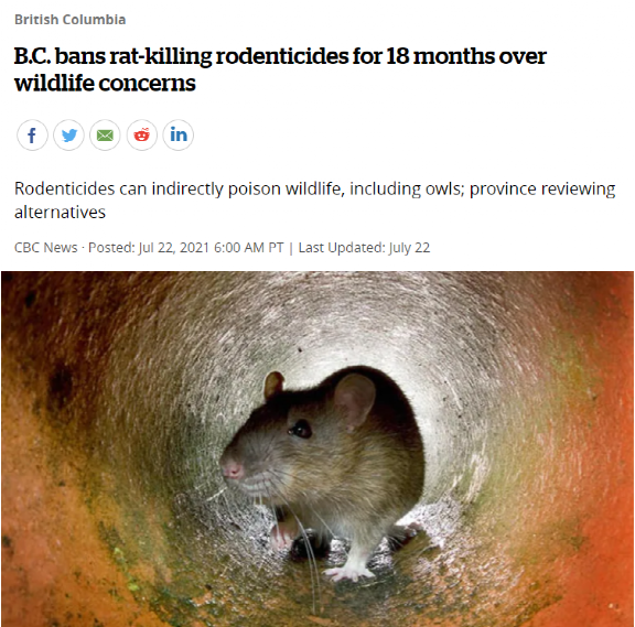该禁令已于7月21日生效,特别禁止使用第二代抗凝血灭鼠剂(SGARS),表示这种药物可能会对食用毒死老鼠的动物造成二次中毒。“我们和许多BC省民一样,都很担心老鼠药会伤害并杀死鸟类、宠物和其他野生动物”。