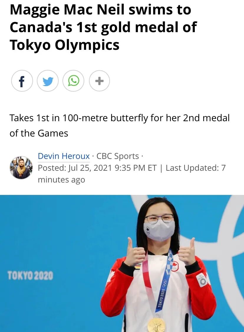 东京时间7月26日,在东京奥运会女子100米蝶泳决赛中,一位来自加拿大的华裔女孩以55.59秒的成绩夺得金牌,这是加拿大在本届奥运会上的首枚金牌。