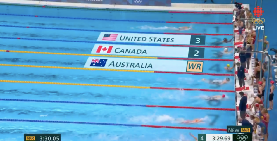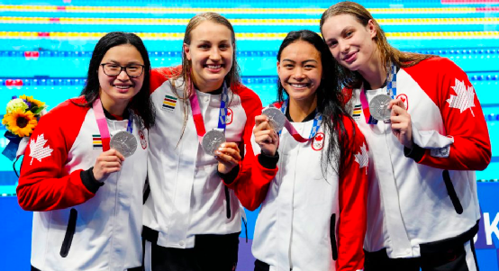 当地时间7月25日,加拿大获得了本次东京奥运会的首枚奖牌——女子4X100自由泳接力的银牌,用时3分32秒78。