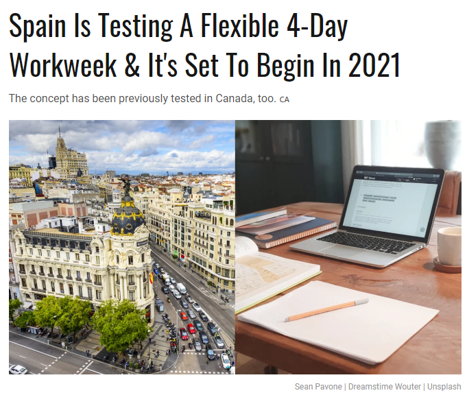 类似的测试在魁北克也有进行,像 Expedibox和David Suzuki Foundation等公司都提供了比传统的五天工作周更“高效”的4天工作制替代方案。