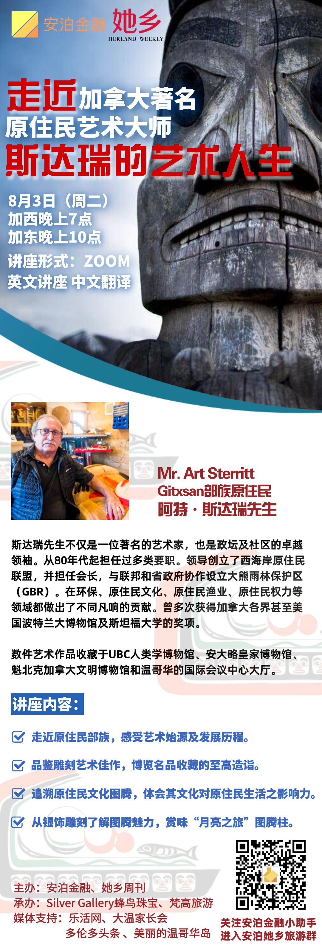 Mr. Art Sterritt – Gitxsan 阿特·斯达瑞先生:出生于BC省北部的榛子镇,Gitxsan部族原住民,目前生活在Prince Rupert。 其艺术创作生涯始于70年代,图腾木雕、绘画、首饰等作品达到很高的造诣。