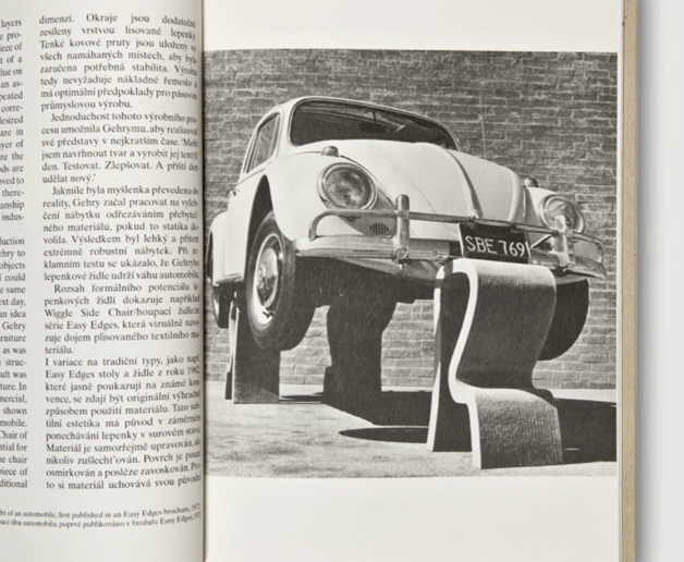 为了证明椅子的承重性能,Gehry特意用几把椅子,把一辆甲壳虫汽车支撑了起来。