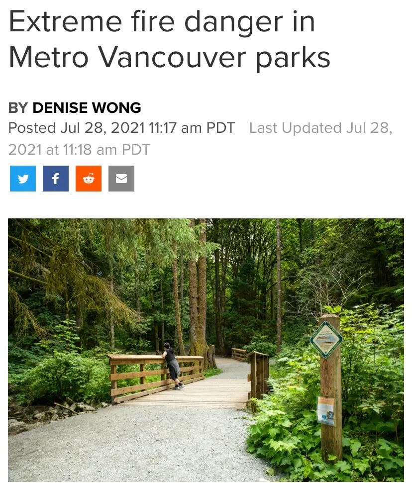 随着炎热干旱气候来袭,大温地区的公园也将火灾等级提升到了“极端”,未来部分公园可能会对公众关闭,以防止野火风险。