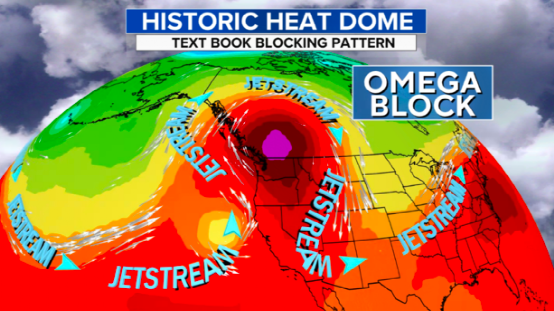 这时,大气气流的波浪会被拉长,以至于发生断裂、静止和旋转的情况。这种情况下,使得两侧的低压形成一面“热穹”,就像压力锅一样,将热浪封锁在了北美地区。天空中热高气压区域停滞不动,并像泵一样不断排斥冷空气,吸收热空气,使气温越升越高。