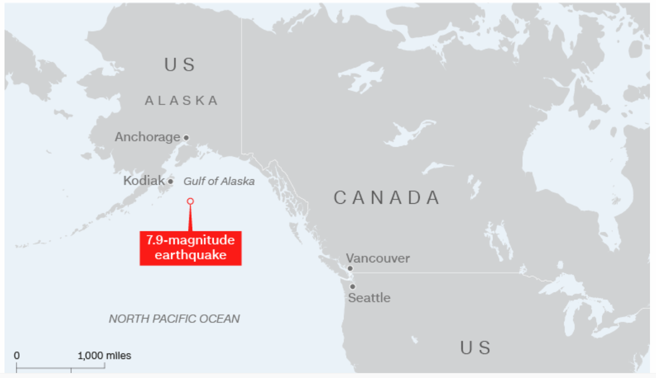 这次地震的中心位于科迪亚克东南约280千米的太平洋上,中心位置北纬55.40°,西经158.00°,震源深度约为10千米,原先报告是8.1级,后USGS修正为8.2级,这是一次超强的浅源地震,如果发生在人口密集区,后果不堪设想。
