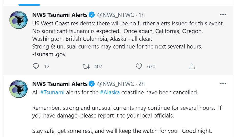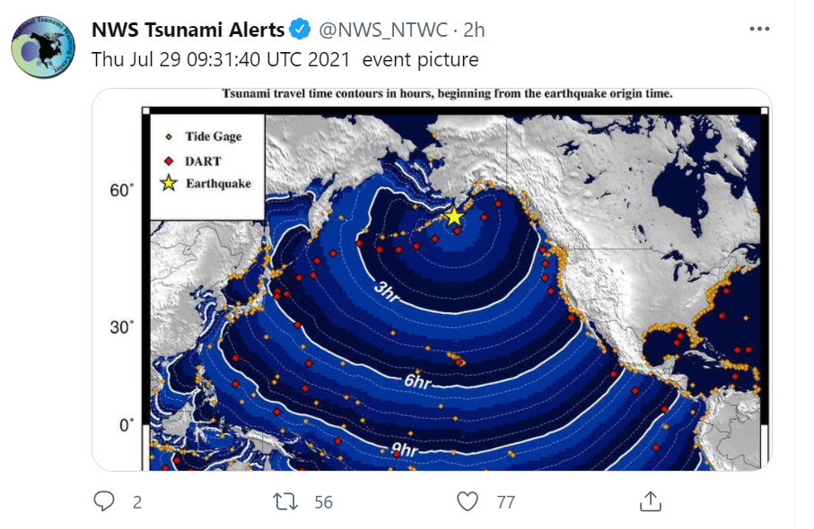 令人诧异的是这次8.2级强震居然没有引发海啸,随着强震的发生,NOAA的海啸预警同时发出,从海啸预警信息中可以看到,3小时内即可到达加拿大西海岸,6小时内到达俄罗斯千岛群岛和日本列岛以及美国加州沿岸,9-12小时抵达中国以及南太平洋群岛。