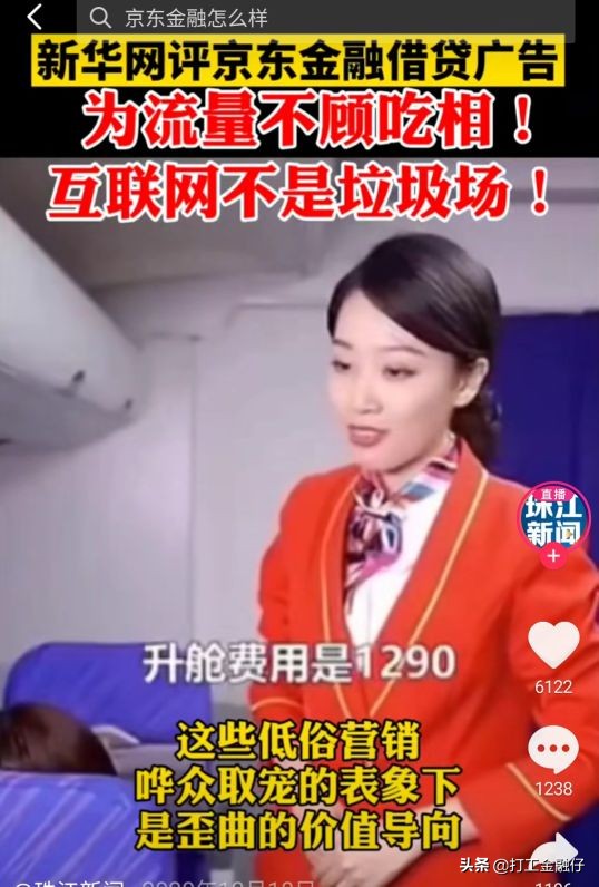 被处罚的具体内容是“一位农民工打扮的人士由于母亲晕机向空姐提出能否打开窗户或更换座位,空姐则向其推销升舱服务,价格千元。这名农民工打扮人士因余额不足无奈放弃升舱,而后排一位西装革履的男子随机帮他在京东金融申请了15万元的“备用金”,称“如果你以后急用钱,不需要再看别人的脸色了。”