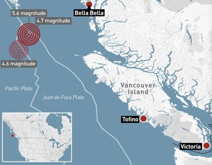 2019年7月3日晚上9点30分左右,BC省北部贝拉贝拉海岸附近211公里处发生6.3级地震。7月5日BC省海岸又发生了三次4.5级到5.6级不等的地震。