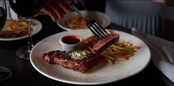 外侧为棕色的熟肉,向内为粉色的半熟肉,中心处还是有血色的生肉,在切开牛排的同时也会看到有血渗出。吃起来鲜嫩爽口,肉质层次感丰富,能够同时体验到多重口感。