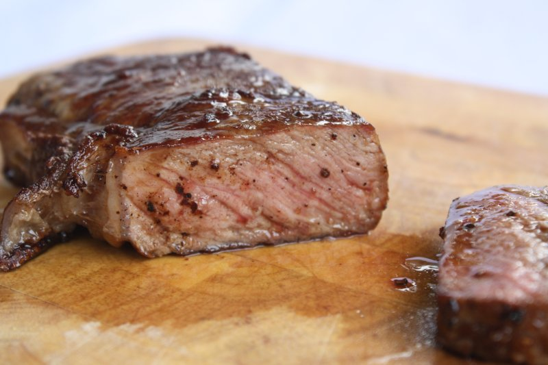 比近生牛排烹制时间稍长,将牛排正反两面及四周快速烹制。牛排内部依旧可以看到大量血色,但兼具烹制过的温度。口感上有了生肉与熟肉之间交汇碰撞的层次感,但依然留有新鲜牛肉的多汁和鲜美。