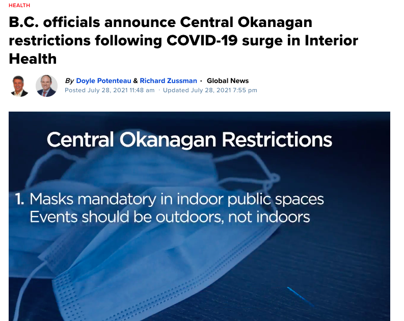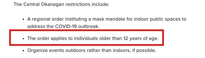 针对内陆卫生局的奥肯那根中部疫情暴发,卫生官还紧急卫生宣布限制,包括要求 12 岁及以上的所有人在室内公共场所戴口罩。