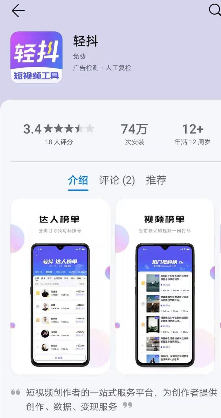 轻抖是为短视频创作者服务的一站式服务平台的APP,它为用户提供了创作工具、数据服务、变现服务三个主要的功能,让身为短视频创作者的你也能实时查看数据进行变现。