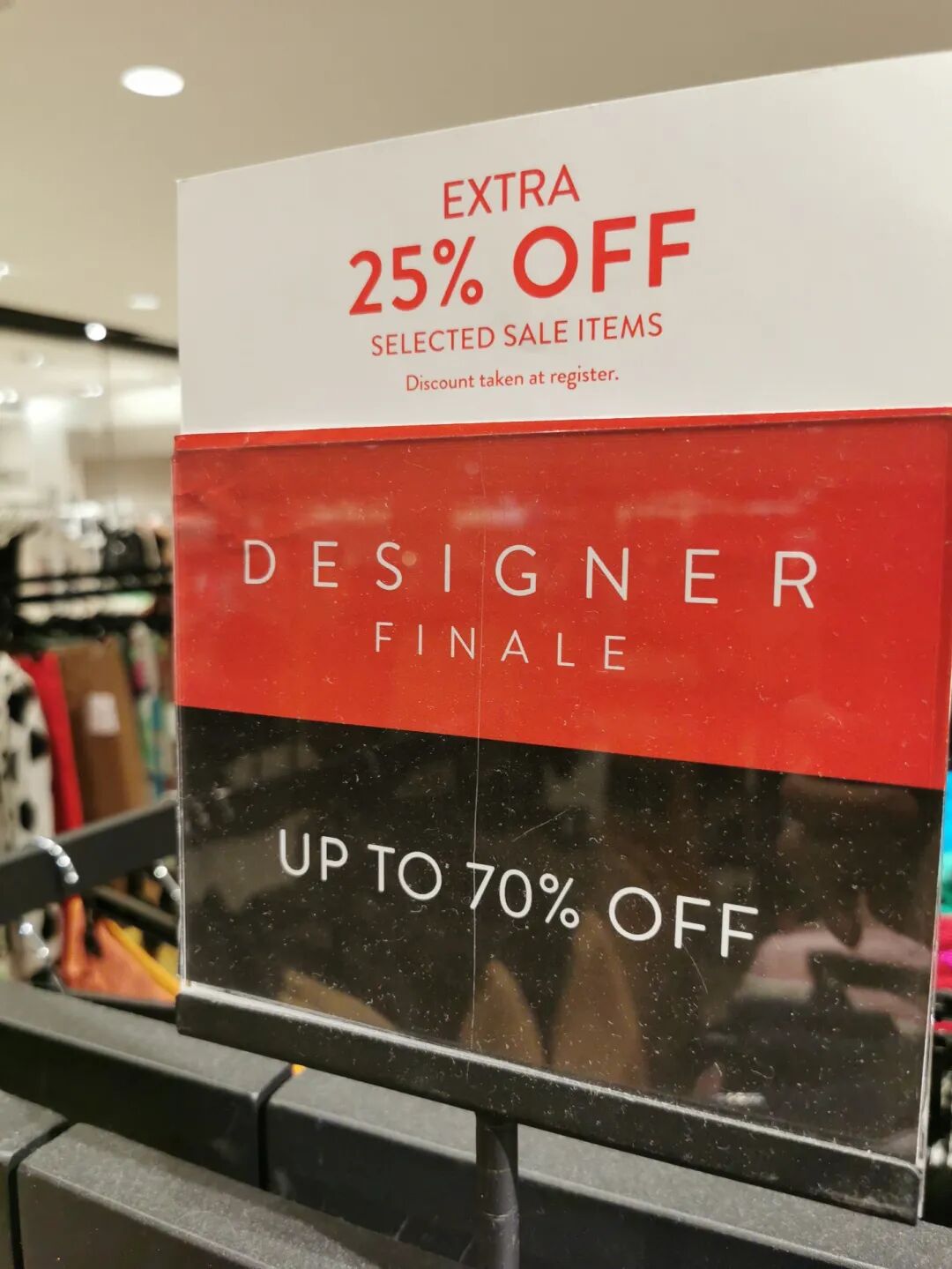 乘坐扶梯直上二楼女装部。吼吼,终于看到我想看的标志了——设计师品牌低至3折部分再额外75折。