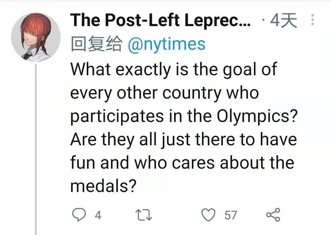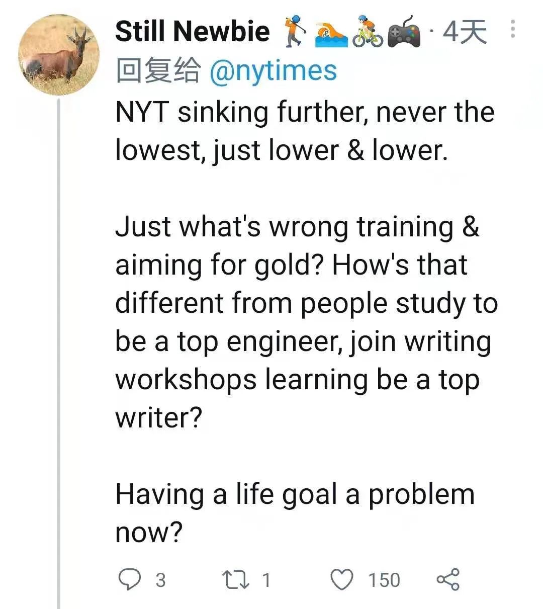 《纽约时报》真的越来越堕落了,没有最low,只有更low。训练和夺金到底怎么伤天害理了?这和立志要成为高级工程师、加入写作培训班当一名优秀作者有什么区别?现在人生有梦想都成问题了?