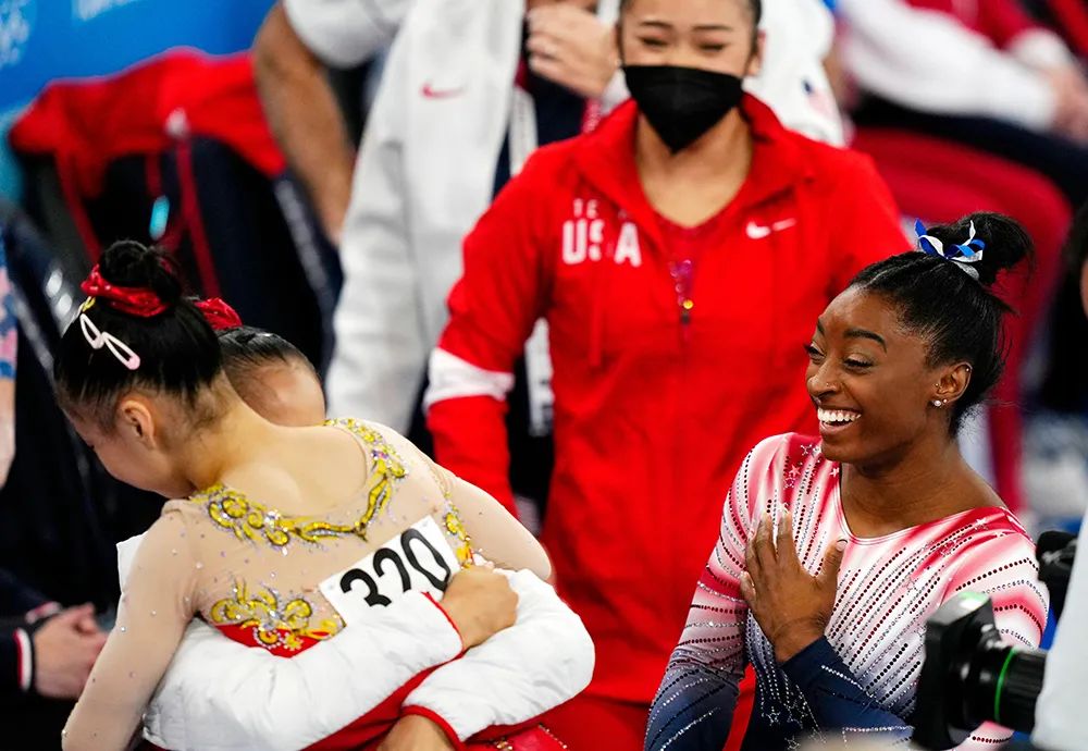 在女子平衡木决赛结束后,获得冠亚军的管晨辰和唐茜靖喜极而泣、相拥庆祝,获得铜牌的美国名将拜尔斯在一旁开心地看着,眼中是发自内心的喜爱和祝福。