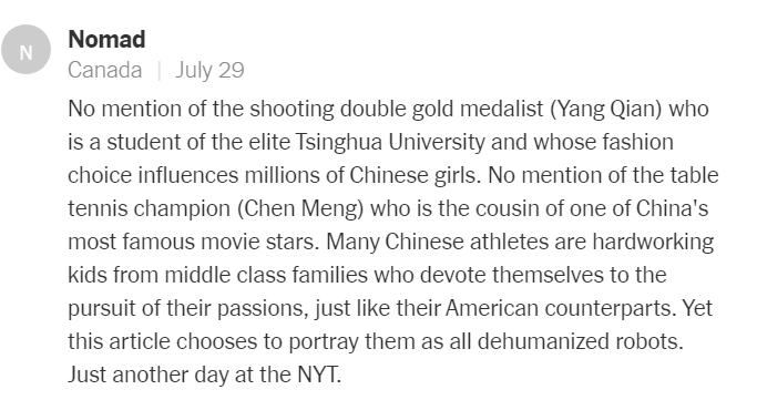 全篇不提射击双料冠军杨倩,她是顶尖高校清华大学的学生,她的时尚打扮影响数百万中国姑娘;也不提乒乓球女单冠军陈梦,她是中国著名影星的表妹。很多中国运动员是来自中等收入家庭里刻苦努力的孩子,他们全身心投入到自己热爱的体育项目中,这和美国运动员没有两样。然而这篇文章却把他们描绘成没有人性的机器人,“纽时”老阴阳人了。