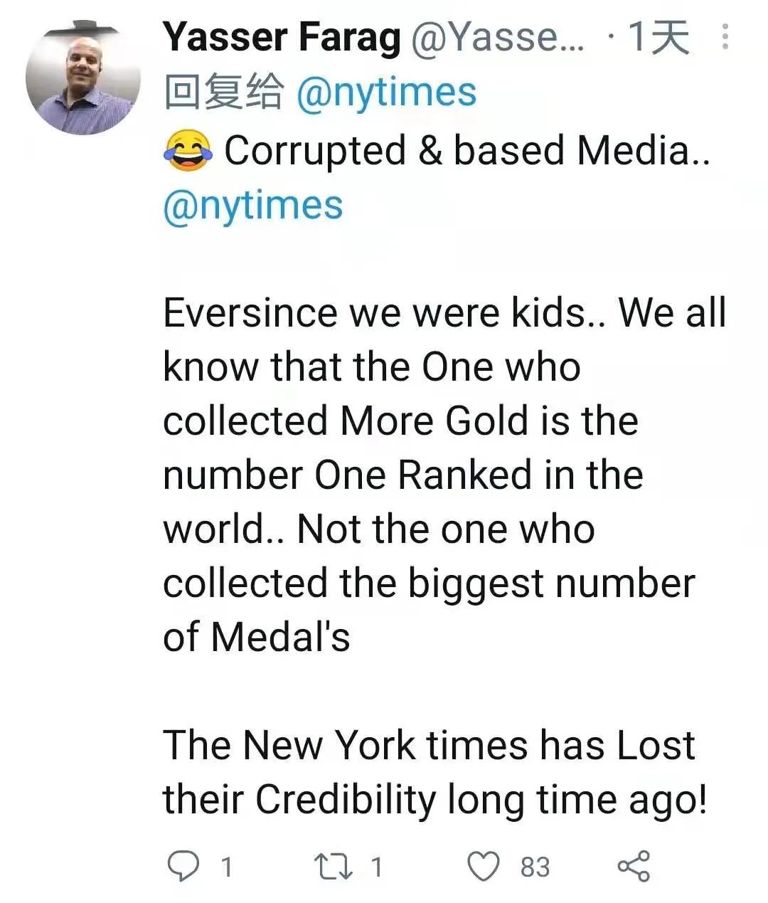 腐败又充满偏见的媒体。我们从小就知道是金牌最多的国家,而不是奖牌总数最多的国家排第一。《纽约时报》早就无信誉可言。