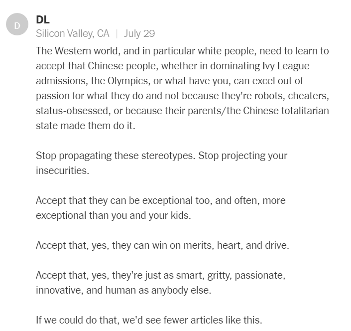 西方世界,尤其是白人,要学会接受这点了,中国人在常春藤联盟录取人数中占多数、在奥运会上领先、在各自的领域出类拔萃,不是因为他们是机器人、骗子、想向上爬,或被家长或中国政府所逼迫,他们就是出于自己的热爱。