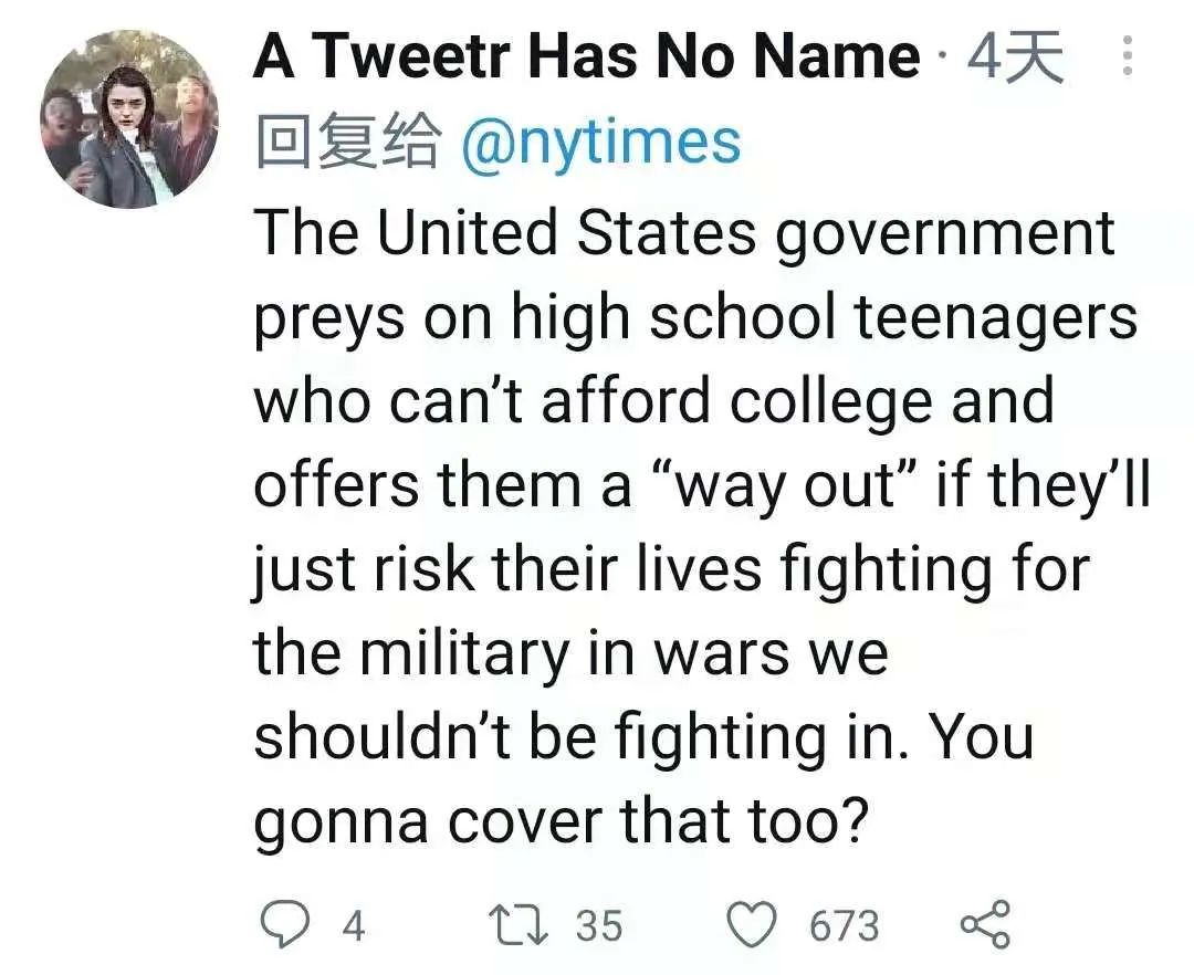 美国政府专门“诱捕”那些付不起大学学费的高中生,给他们提供“出路”,只要他们肯牺牲生命加入那些我们不该发动的战争中。这个你们要不要也报道一下?