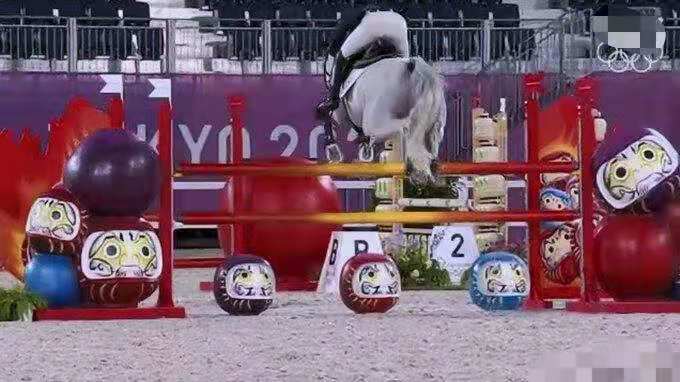 有网友科普,马术比赛里马儿看到有“眼珠”的东西容易受到惊吓,这也是为什么“达摩不倒翁”栏杆处失败率高的原因。