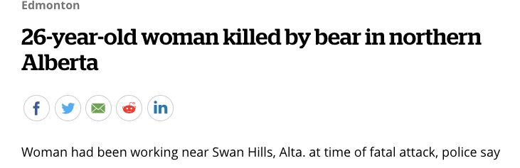 这起惨案发生在上周六,地点位于阿尔伯塔省西北部地区的Swan Hills,应死者的家人要求,死者名字不作公布。据目击者描述,死者当时遭到了一只成年黑熊袭击。