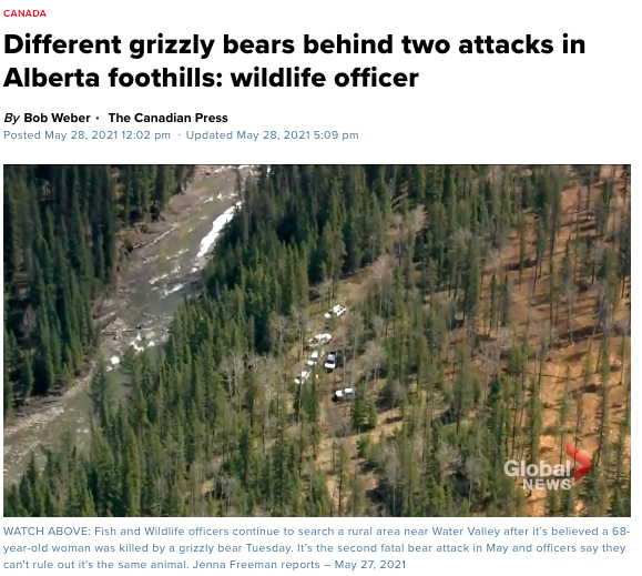 根据阿省鱼类和野生动物协会的一份声明,三周之后( 5 月 27 日), 距离Lertzman死亡地点仅 15 英里,发现一名 68 岁的妇女在水谷旁被灰熊咬死。