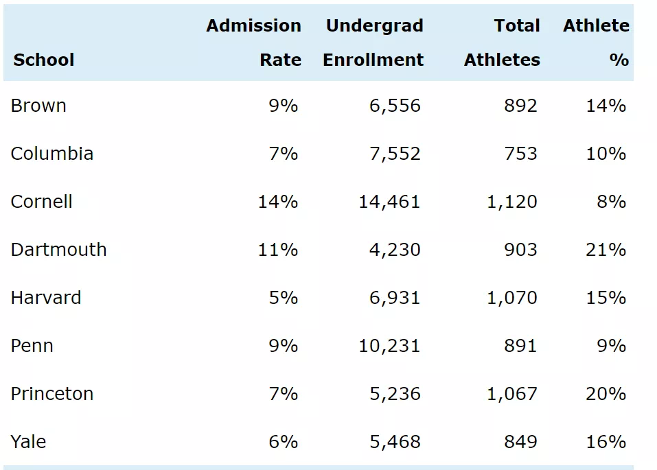 哈佛大学的平均录取率只有5%,而大学代表队运动员占本科生总数的15%。这可是一般录取率的3倍啊!普林斯顿大学的录取率也差不多,只有7%,但运动员占本科学生总数的20%。