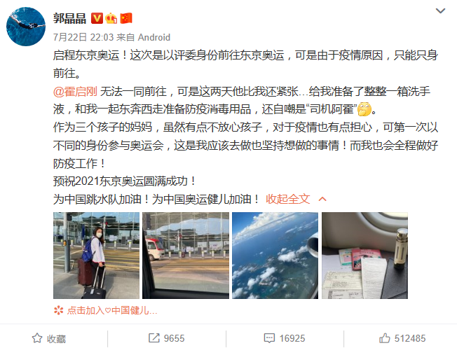 7月22日,郭晶晶以国际泳联技术委员会委员的身份远赴东京。