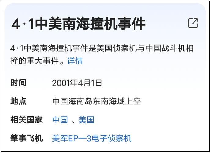 比如,大家最为熟悉的就是2001年发生的“南海撞机事件”。