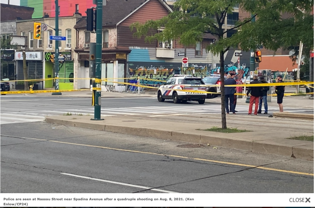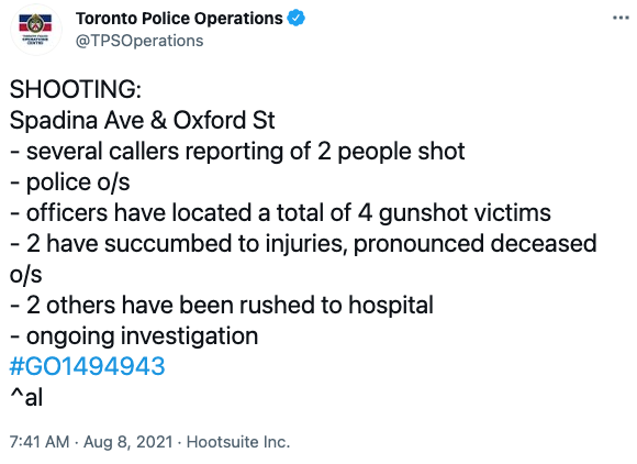 警方周日早上7:41分发推文称,枪击案发生在Spadina Avenue 和 Oxford Street 地区,警方接到枪声的报警。