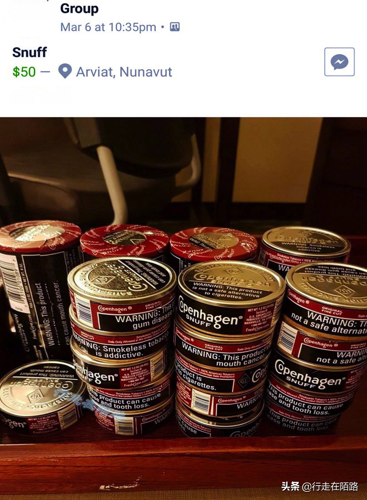 我先后走访三家有烟草销售资质的努纳武特商店,价格最便宜的鼻烟也比内陆城市高出数倍,而且只能在脸书上预定。然而奇怪的是,当我选中一款内陆标价为22.62加元的鼻烟时,销售员却拿出另一款说:“只有这个,50加元,不过你可以多买几盒,十盒也可以。”