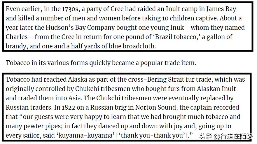 1822年一名俄罗斯船长记录道:看到我们带来烟草与锡制烟斗,因纽特人兴高采烈地跳起舞来,走到每个水手面前都要说“Kuyanna(谢谢你)”。