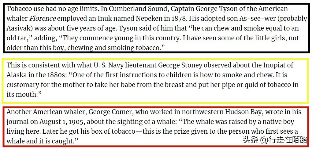 美国历史学家肯·哈伯在《努纳武特》一书中是这么描写土著吸烟的:1878年,美国捕鲸船乔治·泰森船长在努纳武特雇佣了一名因纽特人,意外看到他5岁的儿子正在吸烟,“就像老烟鬼一样”。1880年,美国海军中尉斯托尼在阿拉斯加观察因纽特人,“给孩子的第一个指导就是吸烟,甚至有女人一边哺乳一边往嘴里塞烟斗。”