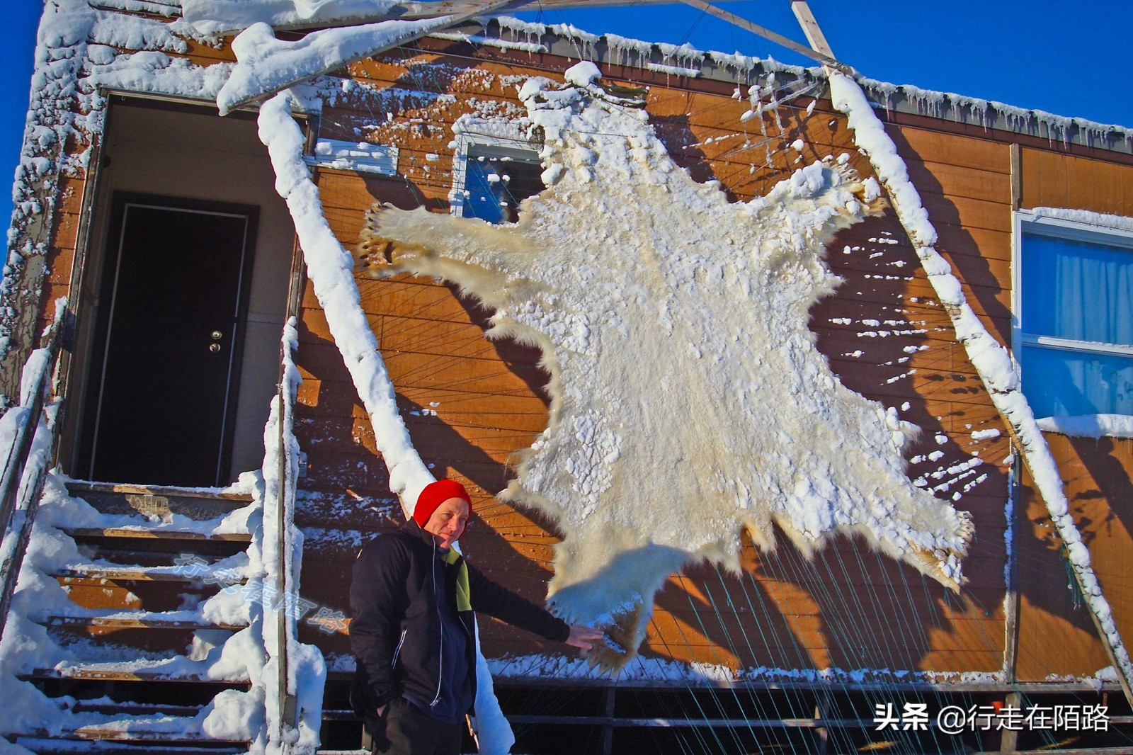 回程途中看到很多房屋门前正在晒制北极熊皮和海豹皮,一名猎人告诉我们,联邦法存在双标规定,对外出售的高价狩猎证没有数量限制,可对土著却实行“一年一熊”,即一名土著猎人一年内只有一头北极熊的捕猎份额,成年北极熊的皮草最长可以拉到5米长、3米宽,他屋前的这张略小,不到4米,售价大约在2-10万加元之间。