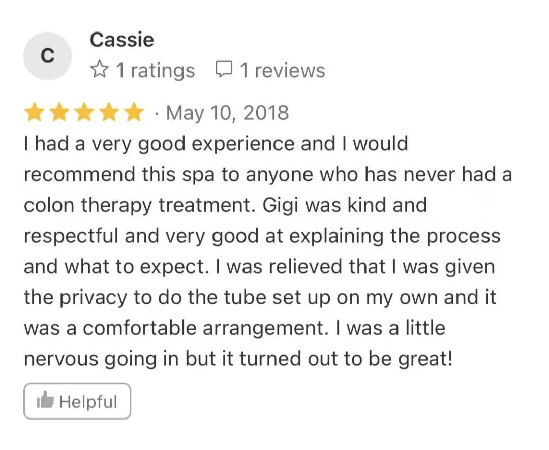 我的体验非常棒,如果你还没试过结肠水疗,请一定要去试试!这家水疗友善专业,整个过程讲解得非常详细,同时又保证了我的隐私,让我太放心了。讲真我之前是非常紧张的,结果太出乎意料啦。