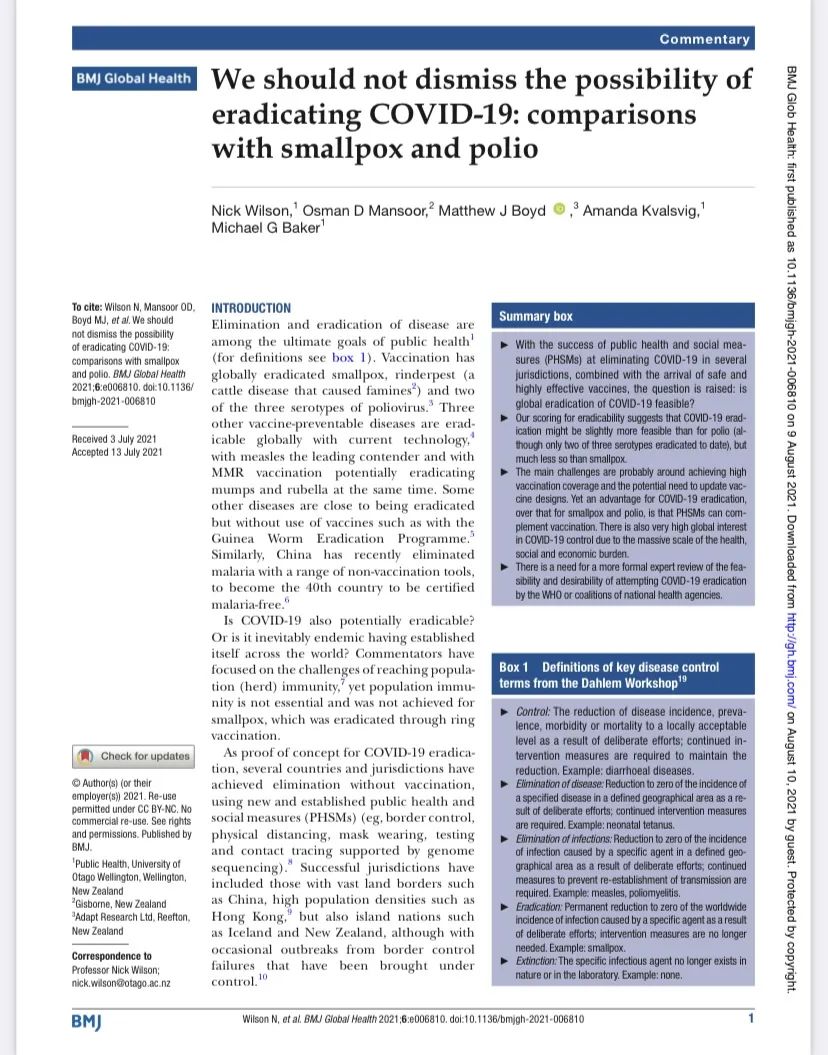 研究人员承认他们的研究是初步的,还需要更广泛深入的工作。世界卫生组织或合作开展工作的国家一级机构联盟需要正式审查尝试根除COVID-19的可行性和可取性。