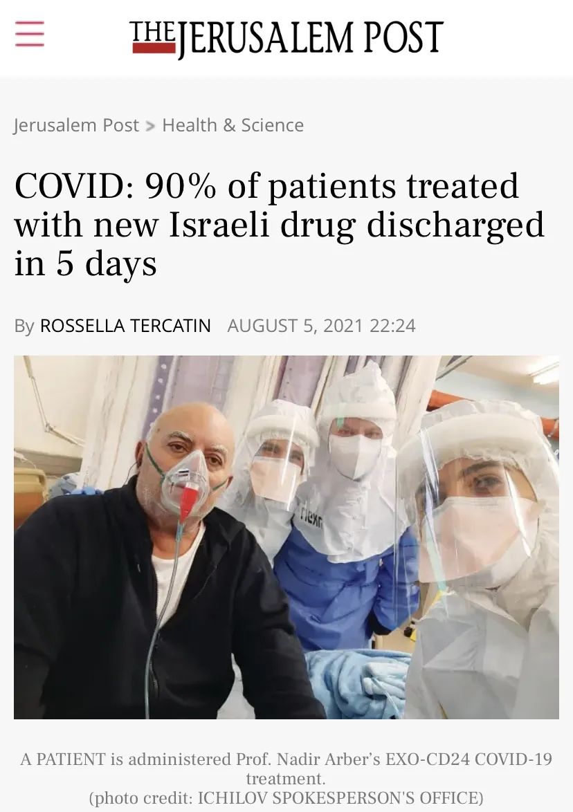 这款由以色列伊齐罗夫医院(Ichilov Hospital)教授纳迪尔·阿尔伯(Nadir Arber)团队研制的抗新冠肺炎新药名为“EXO-CD24”, 是CD24蛋白与外泌体的结合体。
