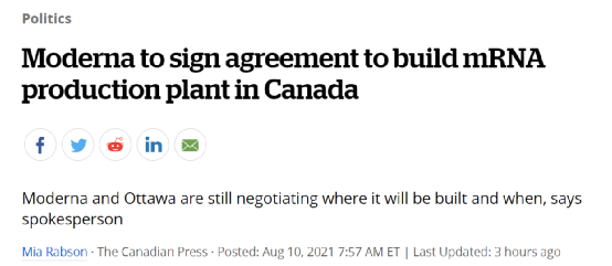 与莫德纳公司的签约,也是加拿大在过去3个月中为把mRNA疫苗国产化,完成的第二笔重大交易。2021年5月加拿大已向安大略省的Resilience Technologies公司提供了1.99亿加元,将其产能扩大,以便每年能生产6.4亿剂新冠疫苗。