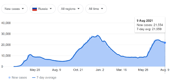 据约翰霍普金斯大学的统计数据,俄罗斯目前似乎刚刚度过第三波疫情的高峰期。截至8月9日,该国累计已有超过638万民众感染新冠病毒,9日当天就新增了21,554例。