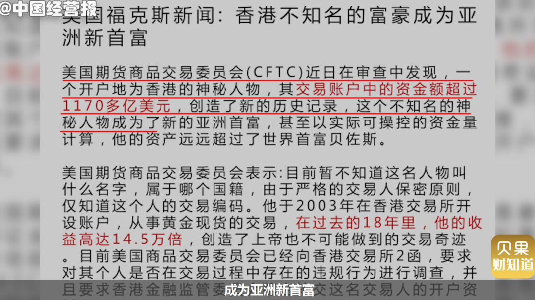 文章称,据美国福克斯新闻报道,美国期货商品交易委员会(简称“CFTC”)在审查中发现,一个开户地为香港的神秘人物,其交易账户中的资金额超过1170亿美元,创造了新的历史纪录,成为亚洲新首富。