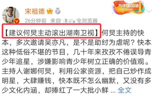 宋祖德专门因为这件事连发多条微博炮轰,他声称,何炅主持快乐大本营多次邀请吴亦凡就是在助纣为虐,这些年来,该档节目已经影响到青少年树立正确的价值观。宋祖德还认为,真正的明星是钟南山、钱学森、袁隆平这些点燃自己照亮他人的科学家,何炅这些人不算是明星,他还呼吁封杀快乐大本营这种低俗的节目。在他的呼吁下,一众网友也纷纷声讨快乐大本营,强烈要求停播快乐大本营。在这样的情况下,导演刘信达也对该节目进行抨击,据他不完全统计,这些年来,快乐大本营前前后后至少8次主动邀请吴亦凡上该节目,主要是想为节目贴金,还是吴亦凡的帮凶,他呼吁有关部门能彻底封杀快乐大本营。虽说吴亦凡上过八次快本这个数字并不算很高,但作为一个没作品、没演技、没实力的艺人,吴亦凡的出镜率可以说是极高了。那吴亦凡上过的综艺节目那么多,快乐大本营为何会成为罪魁祸首呢?作为一个老牌的综艺节目,快乐大本营可以说将“娱乐至上”这四个字诠释到极点,在邀请艺人之前,快乐大本营并没有认真进行挑选,只要是有话题、有流量就会进入他们的选择范围,一旦出现顶流偶像或者大爆炸的作品,必定会来快乐大本营参观一圈,那么作为一档如此有影响力的综艺节目,是否需要好好改革一番呢?快本将一个个娱乐圈明星推上顶流,出个门都是前呼后拥,拍个戏上个节目也是脾气极大,可出场费却高到离谱,反观我们国家的那些科学家及人民子弟兵,又怎么会享受到如此待遇,那些描眉画眼全靠脸的顶流,不仅没实力还劣迹斑斑,凭什么享受来自青少年父母的红利。如今的青少年,科学家不认识几位,要真说起娱乐圈明星可就滔滔不绝,甚至如今很多学生的志向就是当明星,可那又有什么用呢?