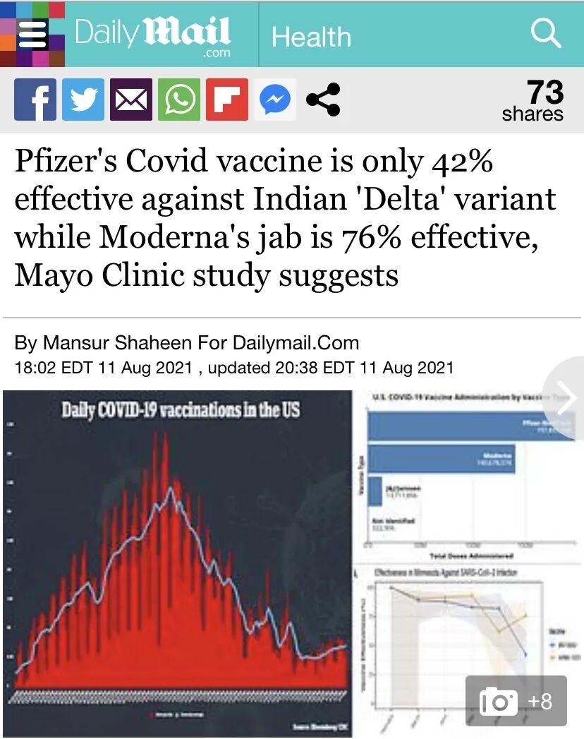 来自美国明尼苏达州罗切斯特市梅奥诊所的研究人员发现:辉瑞疫苗——全世界最多人接种的mRNA疫苗——在7月份对Delta感染的有效率仅为42%,而莫德纳疫苗的有效率稍高一点,为76%。