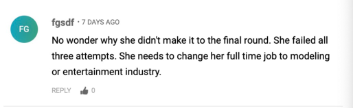 有人说,难怪她进不了决赛,连试3跳都没有成功。还是赶紧改行当模特或者进军娱乐圈吧。