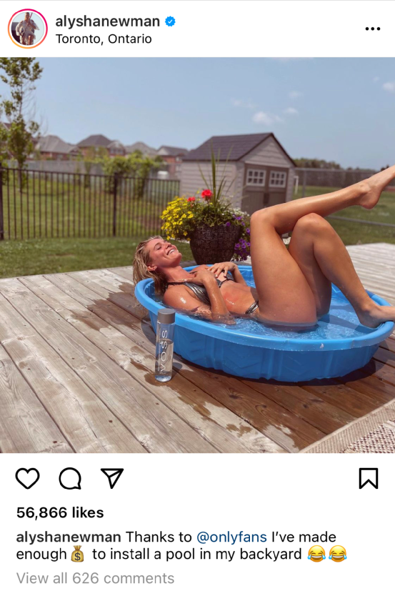 6月30日,Alysha Newman在 Instagram 帐户上发布了一条帖子,用一张极具挑逗性的照片向54.6万名粉丝宣布,其OnlyFans账号正式开通。照片标题中写道:“你的愿望就是我的指令……”