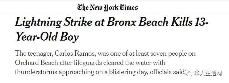 根据纽约市消防局(FDNY)的消息,13岁的拉莫斯(Carlos Ramos)于12日下午5时30分左右,在布朗士的Orchard海滩避暑时,突遇雷雨天气,被闪电击中;急救人员立即将他送至雅可比医疗中心(Jacobi Medical Center)急救,但因伤势过重,被医生宣布不治身亡。