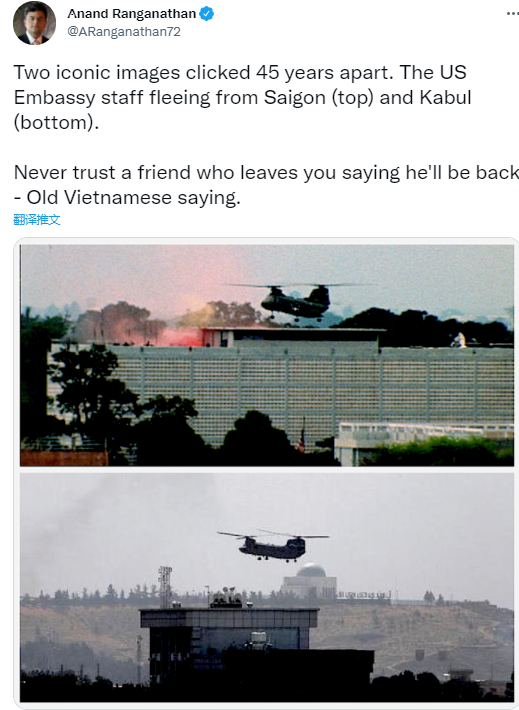 于是经典的一幕出现了,美军直升机飞到喀布尔的美国使馆上空,仓皇撤离美方人员,还因为在大量烧毁机密文件,大使馆上方出现了屡屡烟雾。