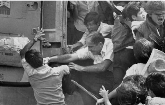 但美国此时已经乱作一团,西贡机场遭到了袭击,所以美国只能用直升机撤离使馆人员,当时的南越带路党和伪政府官员们,都在大使馆外面挤满了,就想跟着美国一起跑路,一个南越高官甚至撕破脸皮争相登机,没想到被美国大使馆的人一拳揍下了飞机。