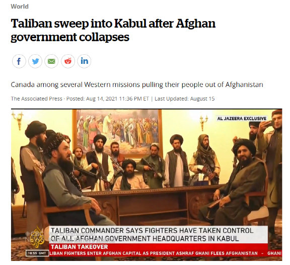 据BBC 8月16日报道,塔利班士兵目前已控制阿富汗该国绝大部分地区,并进入阿富汗首都喀布尔且占领了总统府,这意味着阿富汗政府的垮台,而塔利班即将重掌该国的控制权。阿富汗总统加尼(Ashraf Ghani)已于当地时间8月15日离开阿富汗并前往塔吉克斯坦。副总统萨利赫(Amrullah Saleh)也已逃离喀布尔。